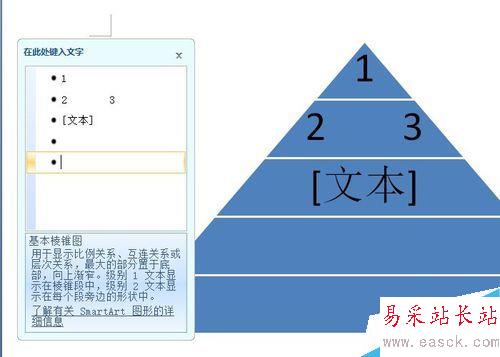 4、鼠标放在文本3中,按下两次回车,添加两个文本栏,同时图中金字塔也增加两层。