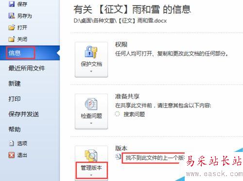 依旧是打开“文件”菜单,在中间看到第三个“管理版本”,如果是已经都保存过的文档这里会提示“找不到此文件的上一个版本”,而若是存在未保存的文件会显示自动保存文档的时间点,上面标明“您可以打开或删除版本文件,在您关闭此文件之前,系统将删除大多数自动保存的版本。”