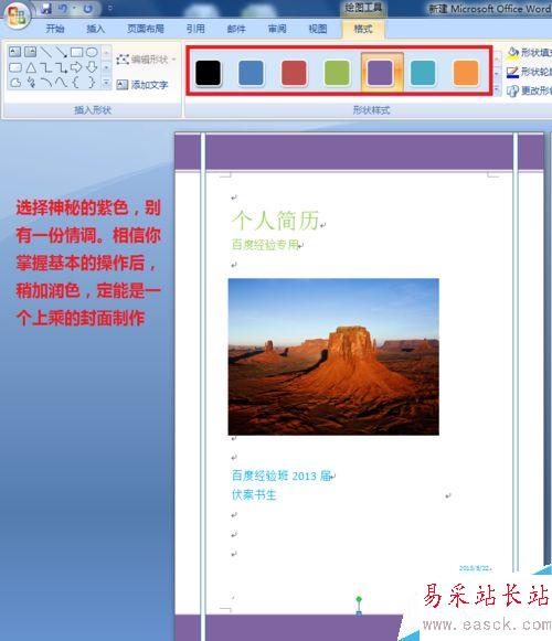 6、双击淡青色区域,你还可以进行颜色的更换,让我们换成女孩子比较青睐的神秘的紫色,是不是整个页面别有另一番情调。本次示范仅演示如何设计。具体的美工过程不是一句两句讲得清的,还需自己多为考虑进行详细的斟酌配色,当然也可以参考他人的配色习惯。这样的封面比起网上的下载封面。相信即使你作为主考官或者面试官。也会为面试者加上些许印象分。