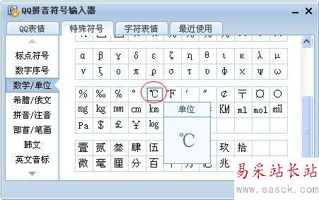 ②在弹出的符号输入器的左边选择“数字/单位”,然后在右边就可以找到想要的“摄氏度”了。