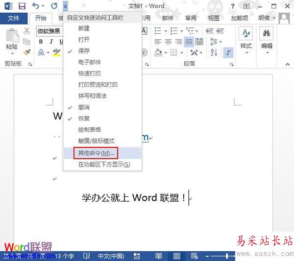 ①启动Word2013,在快速启动栏中可以看到一个向下的箭头,单击它。