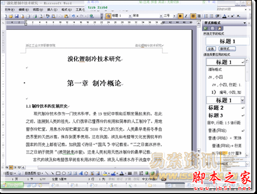 4.用标题1,2,3分别去定义文中的每一章节。定义时很方便,只要把光标点到“第一章 制冷概论”上,然后用鼠标左键点一下右边的标题1,就定义好了;同样方法用标题2,3定义1.1;1.1.1;依此类推,第二章,第三章也这样定义,直到全文节尾。