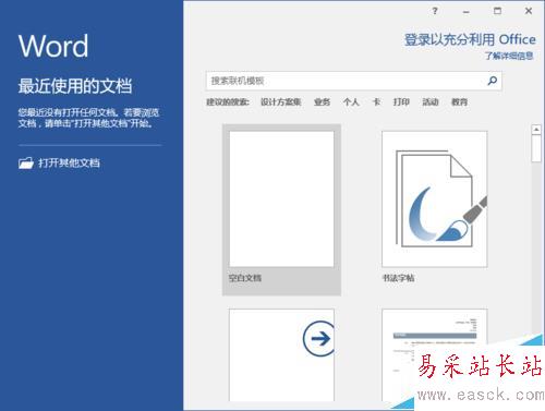 1、在计算机桌面上的Word2016文档程序图标双击鼠标左键,将其打开运行。并点击“空白文档”选项,新建一个空白Word文档。如图所示;