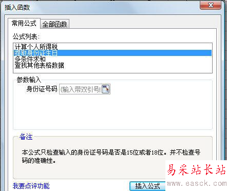 3、在“常用公式”标签中选择“提取身份证生日”,单击进入“参数输入”下面的“身份证号码”右侧的输入框,单击身份证号所在的单元格或直接输入身份证号所在的单元格名称,单击“插入公式”,一个出生日期便提取成功;