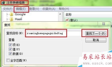 也可以直接在”注册表编辑器“选择"编辑”>>"查找">>查找目标中输入roaminghomepageguidedtag,进行查找,找到后双击进行改值。(如第四幅图)