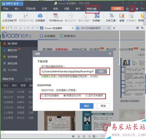 3、如果想再次显示在线模板,打开WPS文档,按右上角红色方框中的的“D”型,弹出在线模板,之后“设置”,在启动WPS画面(选择“显示在线模板“),其配置如下图,按”确定“后,关闭文档,再次打开,则又会显示在线模板了。