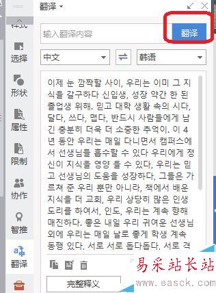 5、这时候就会在页面的右方出现一个翻译的文本框,在方框里点击选择中文——韩语。
