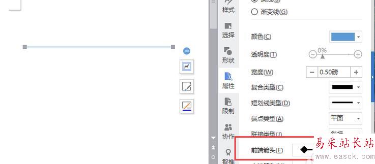 7、在属性对话框中,将前端箭头设置一个样式。如图所示;