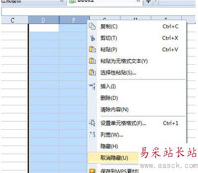 4、这里的话,我们就是需要选定 D 列 和 F 列,然后右键菜单,选择“取消隐藏”即可。
