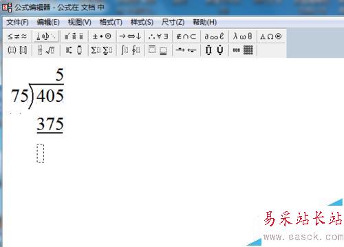 12、在余数那行输入0,结束。如何插入到文档呢?单击文件---更新,就可以把公式插入文档中,然后进行适当的拉伸,调整,看上去就比较美观。
