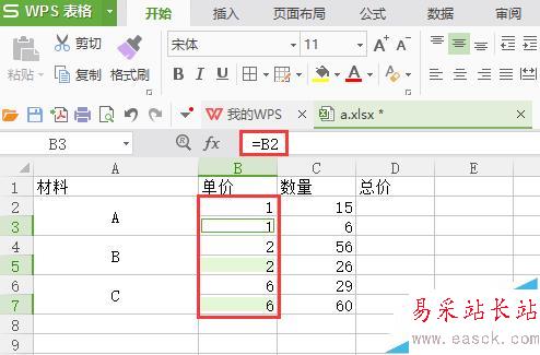 4、在弹出的“定位”对话框中,选择空值,点击确定,输入=B2,单价那些空的单元格也填了值
