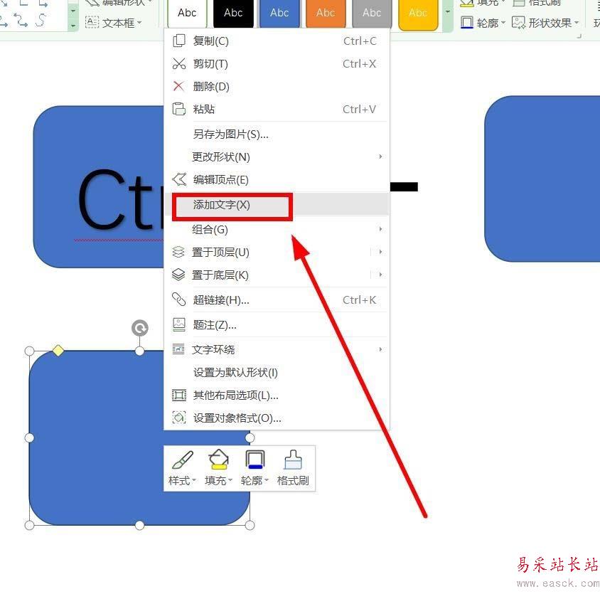 6、选中这个圆角矩形,鼠标右键,选中“添加文字”单击