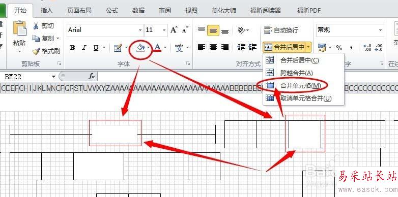 4、如果需要绘制颜色区域面积,可以选中这些单元格后,点击面板中的合并单元格命令,然后使用颜色填充。