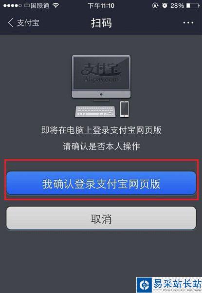 三、扫描成功后,会看到一个“即将在电脑上登陆支付宝网页版,请确认是否本人操作的提示,我们点击下方的【我确认登陆支付宝网页版】即可,如下图所示。