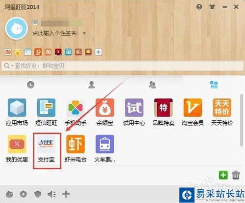 4、在阿里旺旺应用选项卡里找到支付宝,点击支付宝,如下图所示。