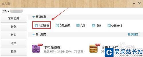 5、点击打开支付宝对话框,在支付宝的基础服务里,我们点击余额查询,如下图所示。