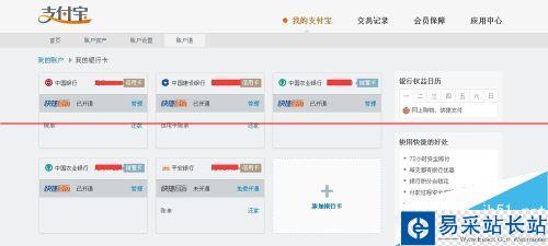 1、首先我们登录支付宝首页,选择右边的其他账户——银行卡,进入银行卡管理页面。