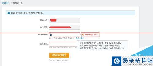 3、如图进入添加银行卡页面,姓名和身份证号默认填写完成,你只需要填写银行卡卡号和银行卡预留的手机号,点击同意协议并确定,绑定银行卡。(注意:快捷支付的银行卡无需开通网银,银行卡必须是本人的银行卡)