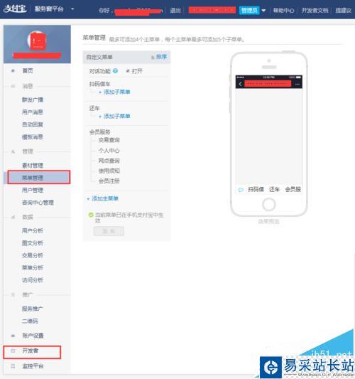 2、如果审核通过后就可以进入服务窗页面,在这个界面可以添加菜单什么,如果所示