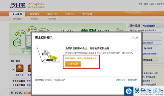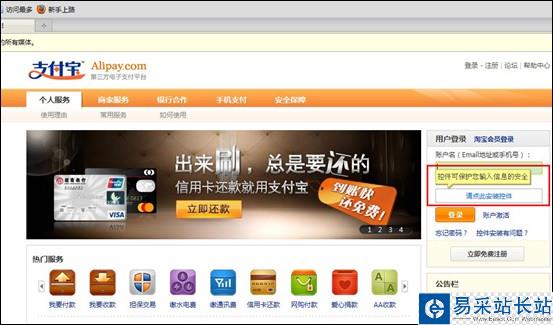 1、打开支付宝首页 www.alipay.com,点击【请点此安装控件】 ;