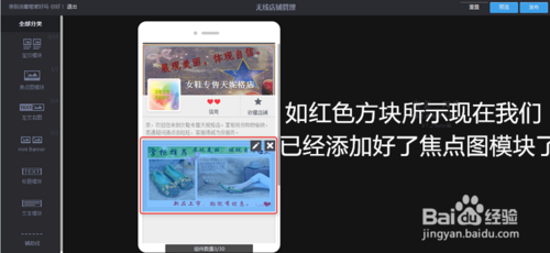 鼠标单击链接地址按钮后,出现如下图所示页面,此时已经说明你已经添加好焦点图模块了,你已经完成了无线店铺焦点图模块的展示工作。然后点击页面右上方的预览按钮,查看自己的设计效果。