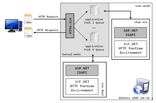 在User Mode下,http.sys接收到一个基于 aspx 的http request,然后它会根据IIS中的 Metabase 查看该基于该 Request 的 Application 属于哪个Application Pool, 如果该Application Pool不存在,则创建之。否则直接将 request 发到对应Application Pool 的 Queue中。