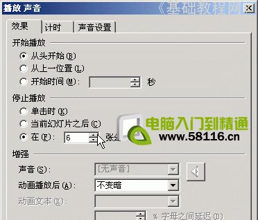 3)在效果选项面板中,单击中间的停止,选择“在 6张幻灯片后”,因为演示文稿总共有6张;