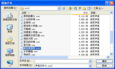 2)在“添加声音”对话框上,选中需嵌入的声音文件(如图2所示,“献给爱丽斯.wav”,3839KB),然后单击“确定”。