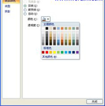 ③接着单击“线条颜色”按钮,选中“实线”单选按钮,并设置线条颜色为“橙色”,然后单击“关闭”按钮完成设置。