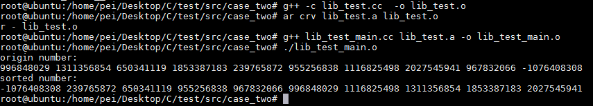 //lib_test.cc#include <iostream>#include <stack>#include"stdlib.h"#include <time.h>#include "lib_test.h"using namespace std;template<class T>void SORT<T>::exchange(T a[], int i, int j){T temp = a[i];a[i] = a[j];a[j] = temp;return;}template<class T>int SORT<T>::partition(T a[],int p,int r){int i = p;int j = p-1;T ref = a[p];int refId = p;srand((unsigned)time(NULL));refId = (rand() % (r-p+1))+ p;//cout<<refId<<endl;ref = a[refId];for(; i<=r; i++){if(a[i] < ref){j++;exchange(a, i, j);if(j == refId){refId = i;}}}exchange(a, j+1, refId);return j+1;}template<class T>void SORT<T>::myQsort(T a[],int p,int r){int q = 0;if(p<r){q = partition(a, p, r);myQsort(a, p, q-1);myQsort(a, p+1, r);}return;}template<class T>void SORT<T>::myQsortNoRecur(T a[], int p, int r){int start = p;int end = r;int mid = 0;std::stack<int> sortStk;sortStk.push(p);sortStk.push(r);while(!sortStk.empty()){end = sortStk.top();sortStk.pop();start = sortStk.top();sortStk.pop();if(start < end){mid = partition(a, start, end);sortStk.push(start);sortStk.push(mid -1);sortStk.push(mid + 1);sortStk.push(end);}}}OK,我们尝试编译.a静态链接库