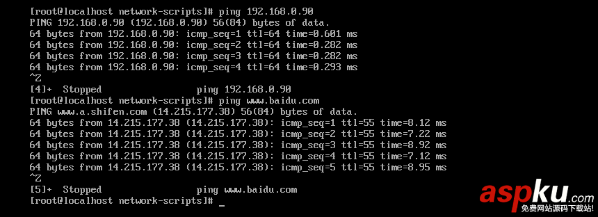 最后再通过ping命令测试内网环境以及外网环境是否能够接通,使用Ctrl+z可以断开测试,继续执行其它操作: