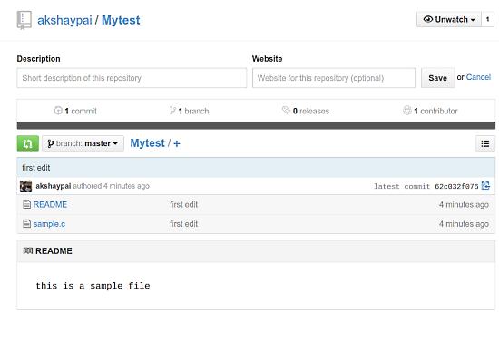 上述将Mytest 目录里的所有内容(文件)推送到了GitHub。对于以后的项目或者创建新的仓库,你可以直接从步骤 3 开始。最后,如果你登录你的 GitHub 账户并点击你的 Mytest 仓库,你会看到这两个文件:README 和sample.c 已经被上传并像如下图片显示:
