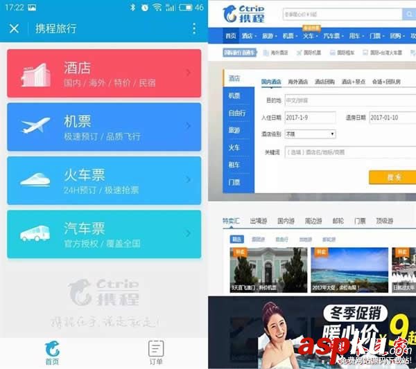 从页面整体看,携程小程序比web端简洁太多。酒店、机票、火车票、汽车票四大产品入依次排列,交易完成后可以在下方查询订单。