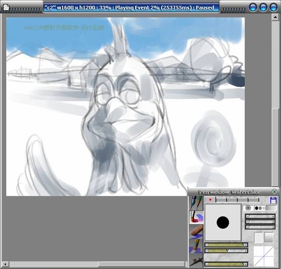 6.开始塑造主体对象,画出卡通鸡的头部体积关系。由于intuos3数位板的1024级压感笔等功能,使得从草图到上色都可以非常自然的完成。