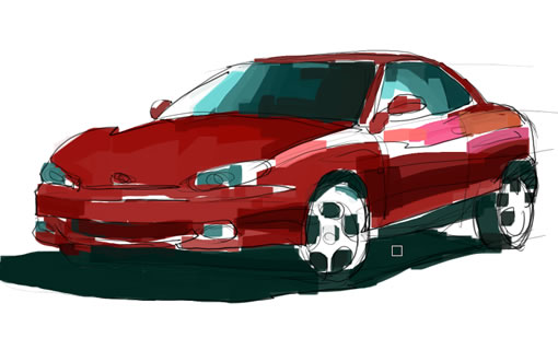 4.选择一个中等大小的方头笔刷,把笔刷的不透明度调节到70%左右,形成半透明的笔触效果。在背景层上开始上色,画出车体大致的色彩和阴影部分。