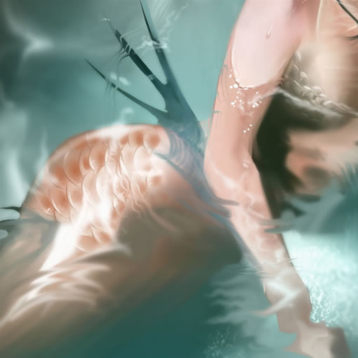 4、刻画身体部分。在小臂和大腿外侧加上鱼鳍。因为设计中这条人鱼人体有一部分是在水里的所以在画的时候裸露在外面的部分就要亮一些,相反,在水中的部分会稍微暗些。