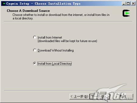 第二步:选择安装类型。由于我们已将安装程序下载到了本地硬盘,故选择第三项,然后单击“下一步”。