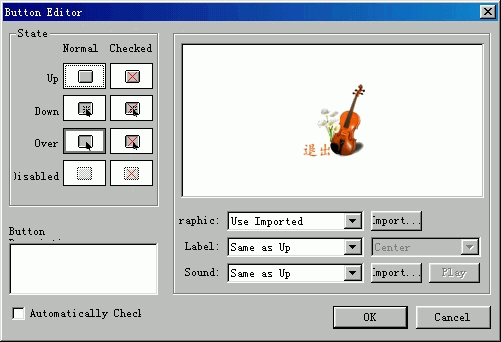 我们还可以为按钮的每种状态添加上指定的音效,点sound栏右边的“imort”按钮,导入按键效果音响。