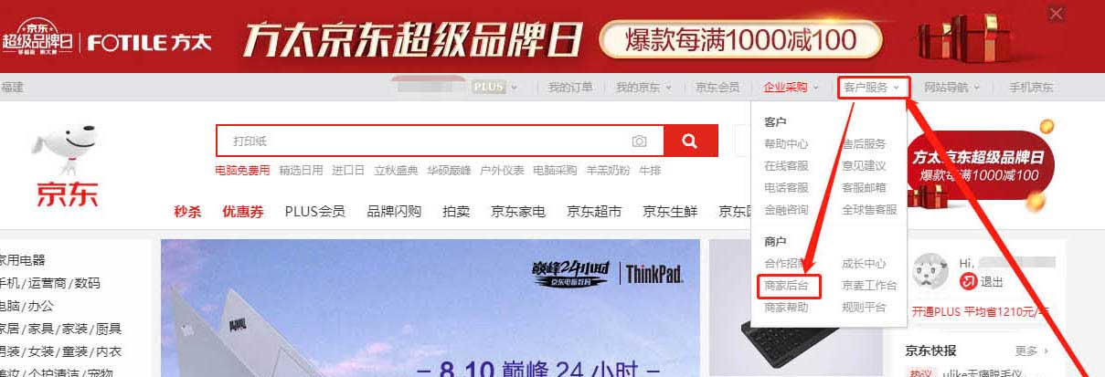 4、在顶部,找到“客户服务”,下拉“客户服务”的复选框,选择“商家后台”