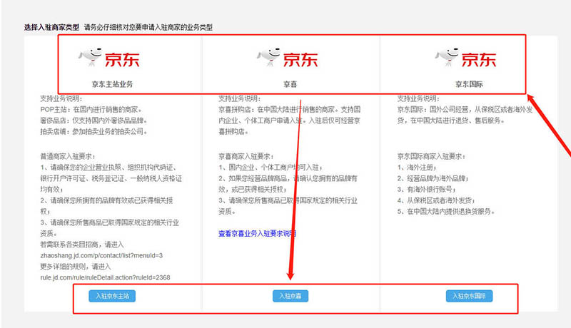 6、跳转到入驻页面,这边根据自己需求选择京东主站(也就是平时大家用的)、京喜或者是京东国际;之后填写一些信息,即可入驻了