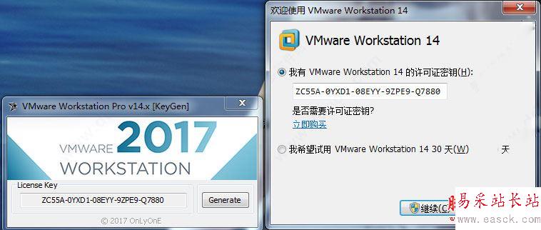 7、打开VMware 14注册机,点击“Generate”,然后将生成的VMware 14注册码复制负内即可完成破解。