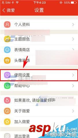 1)打开微爱,点击右上角的【齿轮】,接着点击【使用设置】;(如下图)
