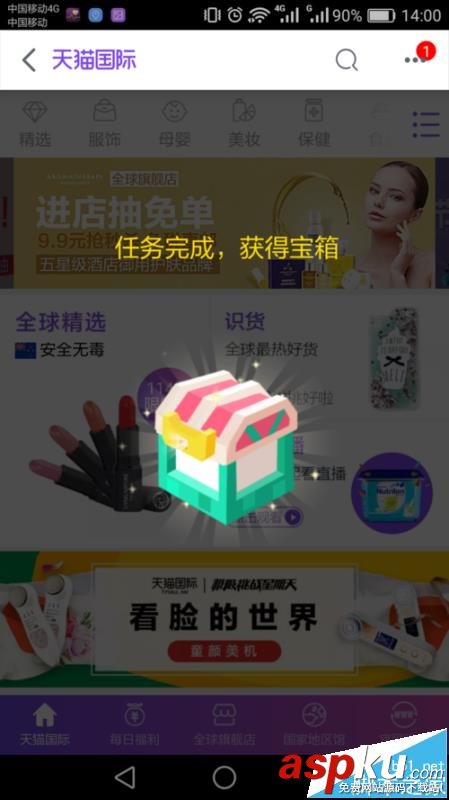3、点击上面两个任务,进入到任务栏里面,第一个任务是“进入天猫国际首页浏览首页十秒钟”。进入后等待十秒钟,也可以在里面查看十秒钟。