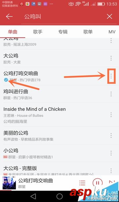 4、点击选择要播放的歌曲(会播放歌曲),试听完毕后要点击歌曲最右侧的“更多”按钮