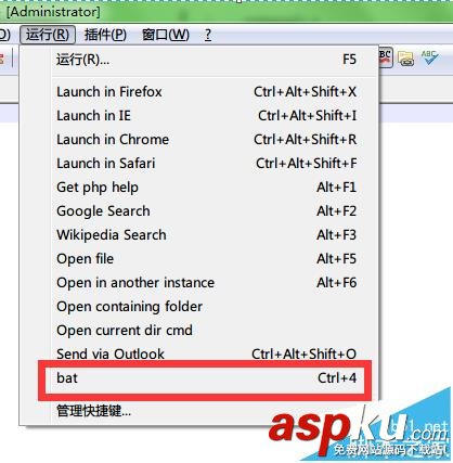 6、notepad++写好代码之后,点击运行菜单,选中bat。或者直接按ctrl+4组合键快速运行批处理。