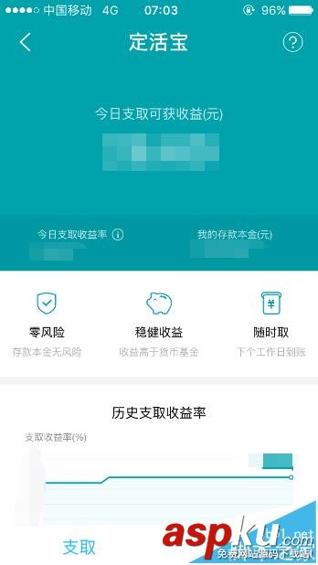 2、此时会弹出“定活宝”页面,在这里用户会看到当前的定活宝收益,而且还能看到当前支取的收益率是多少。如有想要提取定活宝中的现金,点击页面左下角的“支取”按键。
