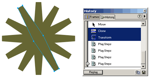4、 打开history面板,此时您会看到history面板中了clone和transform这二个命令,按住shift键选择这二个命令,然后点击底部的replay按钮四次。