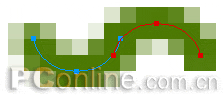 我们再来绘制它的嘴吧。先画一个5*5大小的圆,取消其填充色,选用2像素的柔化描边,描边色为# 4b7801。然后用“路径切割”工具将该圆一分为二,如图27。