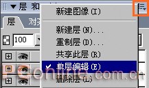 同样为了对象选取的方便,我们在“层”面板右上角的下拉菜单中,将“单层编辑”功能取消掉,使鼠标能够跨图层进行对象的选取,如图03。