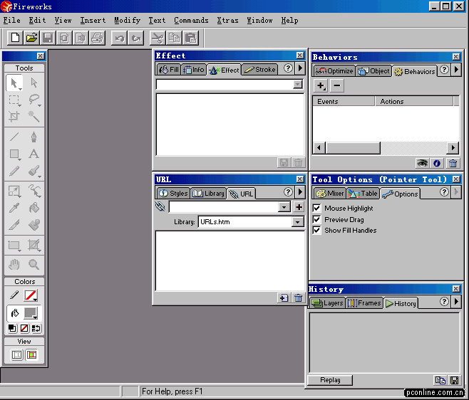 3、增强的工具面板。在fw4,我们就已经发现了mm公司已经有意识的在工具面板的布局上做了一些相应的归类摆放;在fwmx中,我们可以发现工具箱的分类更加详细了——select选择工具组、bitmap位图工具组、vector矢量图工具组、view视图切换等等……,为了便于大家的理解,我们可以通过下面的图片来直观的理解一下fwmx较fw4的不同之处: